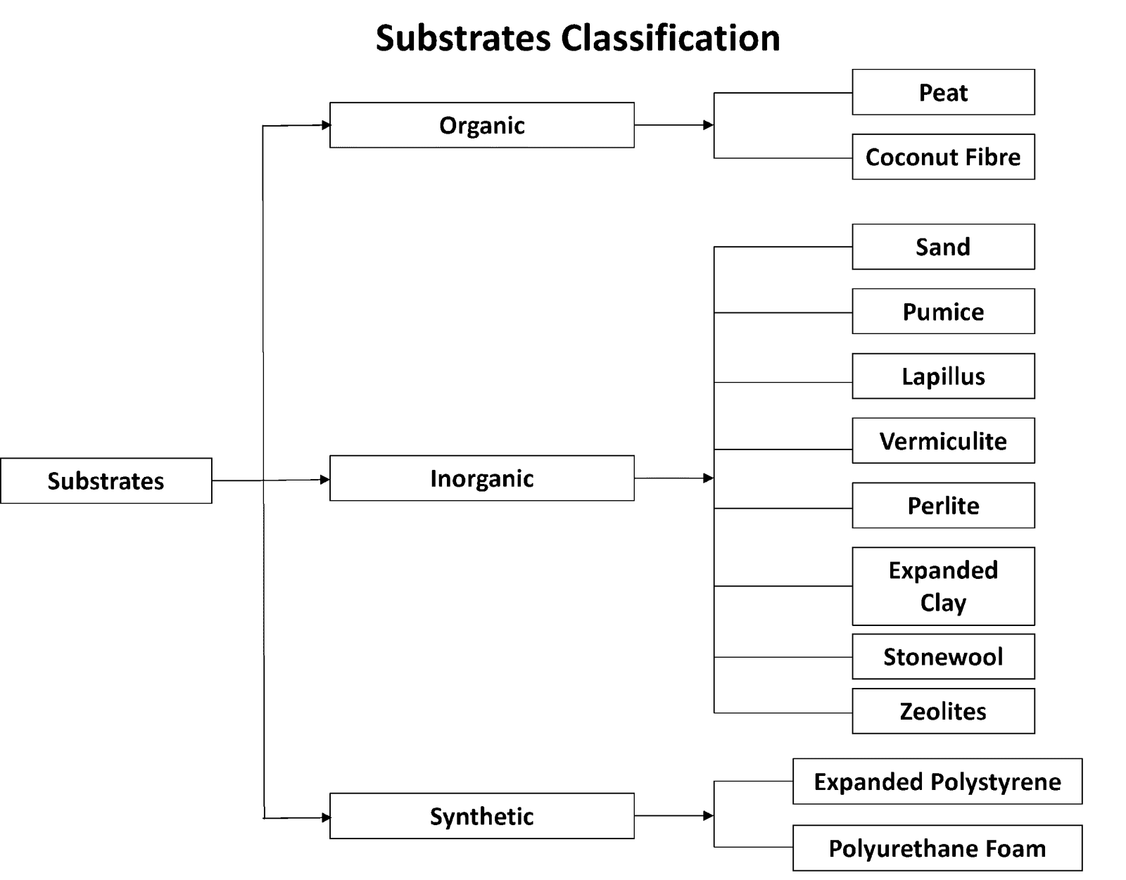 Organic substrates (peat, coconut fibre, bark, wood fibre, etc.) Inorganic substrates (stone wool, pumice, sand, perlite, vermiculite, expanded clay) Synthetic substrates (polyurethane, polystyrene) |