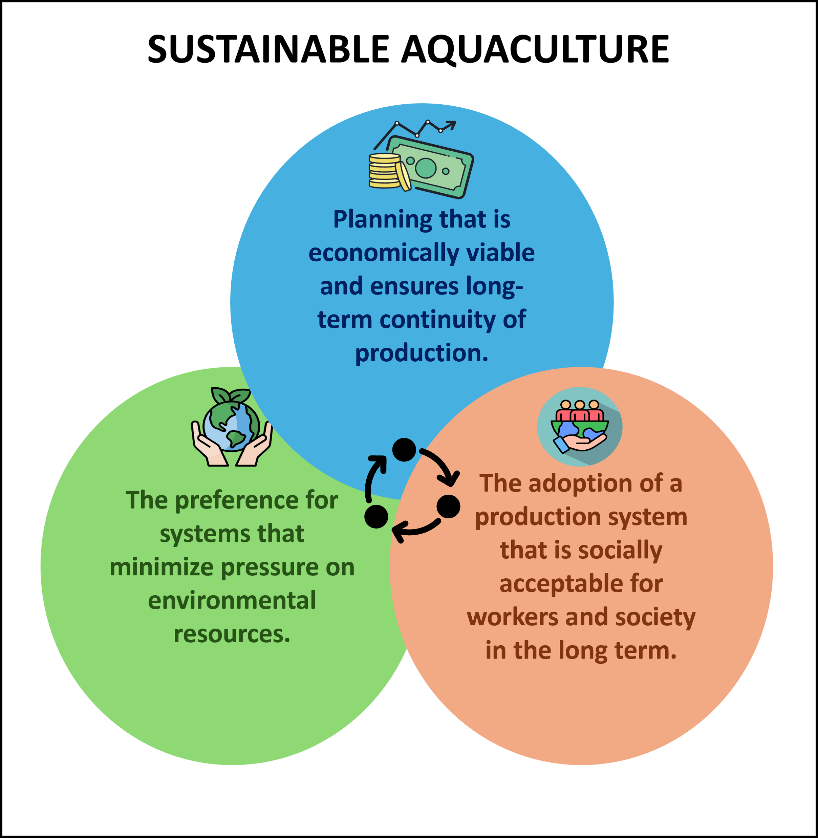 The concept of sustainable aquaculture management has been defined within this training program particularly in the context of the production methods addressed in Module 1, the water footprint and wastewater management in aquaculture production examined in Module 6, the carbon footprint and the management of generated wastes in aquaculture production discussed in Module 7, and the social components of aquaculture production analyzed in Module 8. These evaluations, conducted through the environmental impacts, resource use, and social effects of open, semi-closed, and closed systems, demonstrate that sustainability is directly linked to system selection. Similarly, FAO (2024) defines sustainable aquaculture as the holistic management of production systems that minimize environmental impacts while being economically viable and socially acceptable.
