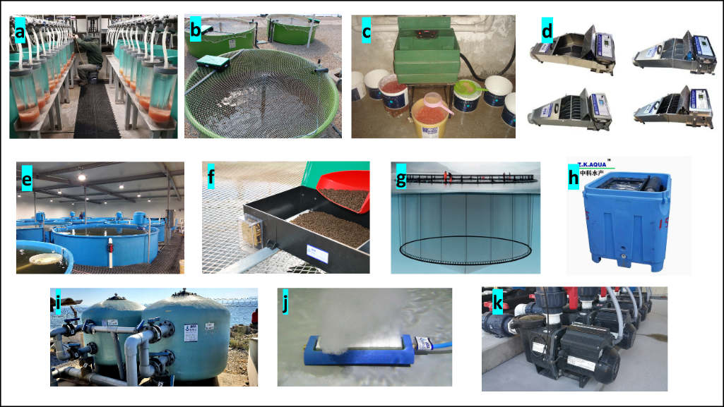 Figure 2. Some of the technologies and treatment units used in aquaculture production systems include: a. egg incubators b. circular hatching tanks c. egg counting and sorting machines d. fish counting machines e. fish tanks f. belt feeding systems and feeding scoops g. netting materials h. aquaculture transport equipment i. sand filters j. diffusers k. fixed-flow technology aquaculture pumps (Akuamaks, n.d.; Aydın Balık Ağları, n.d. ; Fresh by Design, n.d. ; FPT-Gıda İşleme Teknolojileri, n.d.; Made-in-China, n.d.).