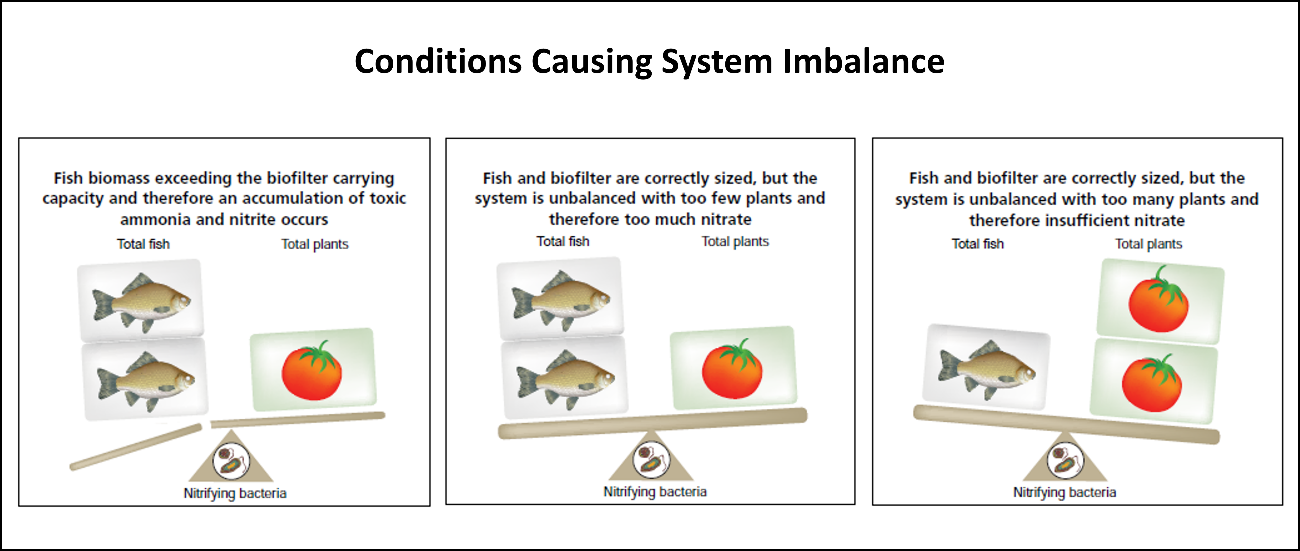 As shown in Figure 4, system imbalances occur when the fish biomass exceeds the biofilter capacity, when plant biomass is insufficient, or when plant biomass is excessive.