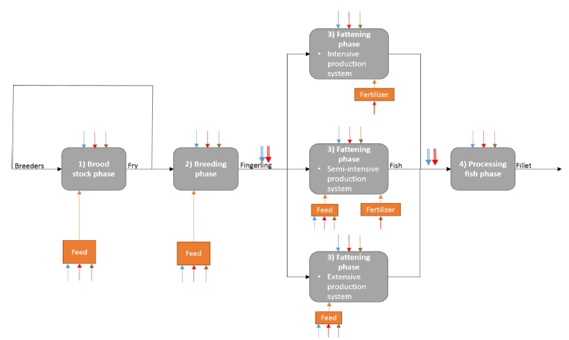In the study conducted by Guzmán-Luna et al. (2021), the blue, green, and grey water footprints of one ton of tilapia produced in extensive, semi-intensive, and intensive production systems in Mexico were calculated (Guzmán-Luna et al., 2021). The production stages considered in the study include broodstock, fingerling production, grow-out, processing, and transportation. Production was carried out in three different modes: extensive, semi-intensive, and intensive. Within these systems, fish mortality rates and inputs such as fish feed, fertilizers, and hormones vary. Figure 1 shows the production stages considered in the study.