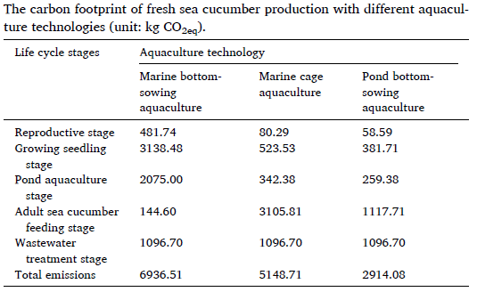 Table 4. Carbon footprint of fresh sea cucumber production using different aquaculture technologies (unit: kg CO₂eq) (Yang et al., 2024).