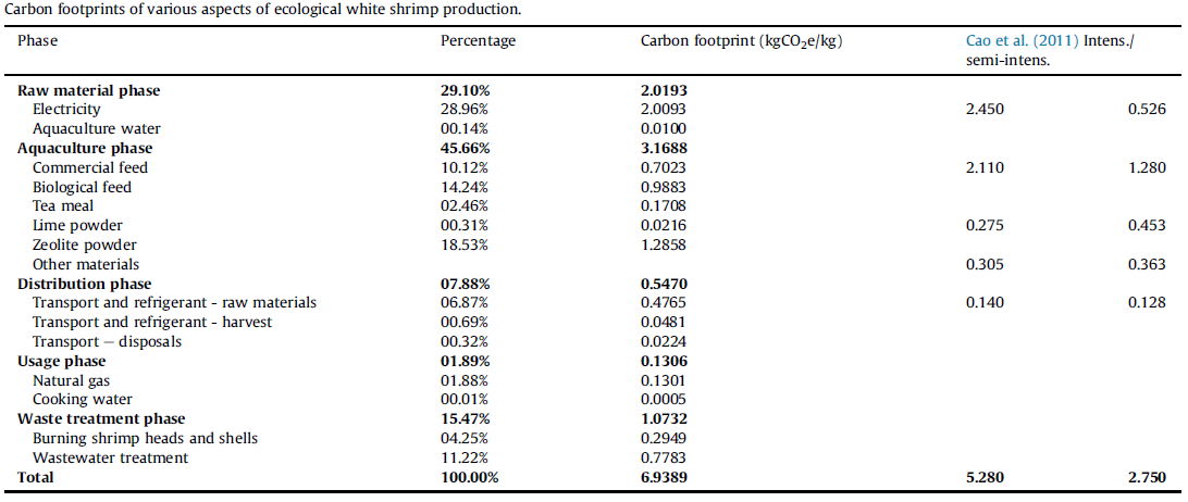 Table 2. Carbon footprint results for the production of 1 kilogram of shrimp (Chang et al., 2017).