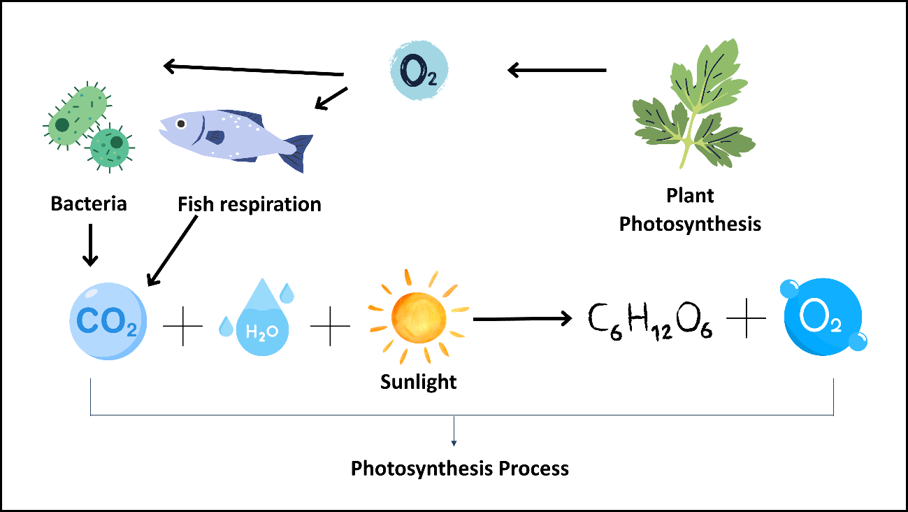 In aquaponic systems, plants use the CO₂ released by fish and bacteria through photosynthesis, producing oxygen (O₂) in return, thus maintaining balance within the system (Friendly Aquaponics, 2023). This oxygen is essential for the survival of both fish and bacteria. In this way, a continuous carbon–oxygen exchange takes place between fish, bacteria, and plants, creating an ecological balance within the system. Figure 10 shows the carbon cycle occurring in aquaponic systems.