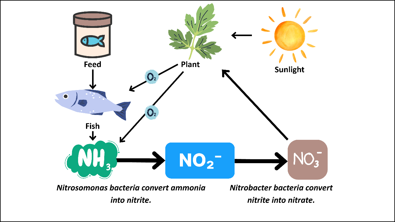 In aquaponic systems, the nutrients present in wastewater are recovered through their uptake by plants. Microorganisms are also required in these systems to facilitate the transformation of wastes originating from fish and feed. In aquaponic systems, bacteria carry out the nitrogen cycle. In order to convert nitrogen into a form usable by plants, nitrification bacteria transform ammonia into nitrite and then nitrite into nitrate. Because dissolved substances are filtered by plants in aquaponic systems, the need for additional biological and chemical filtration is reduced (Yavuzcan Yıldız & Pulatsü, 2022). Figure 2 schematically illustrates the aquaponic system cycle.