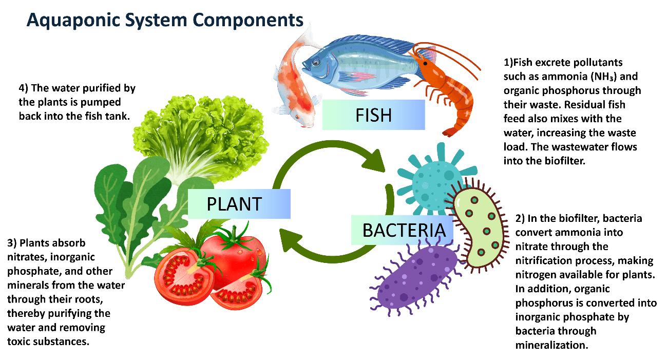 In these systems, the recovery of waste through ecological processes such as the nitrogen, phosphorus, and carbon cycles is achieved. Wastewater generated in aquaculture tanks flows into the biofilter. In the biofilter, bacteria convert ammonia into nitrate through the nitrification process, making nitrogen available for plants (Kim et al., 2005). In addition, organic phosphorus is converted into inorganic phosphate by bacteria through mineralization (Kim et al., 2024). Plants take up nitrates, inorganic phosphate, and other minerals from the water through their roots, thereby purifying the water and removing ammonia and nitrite, which are toxic to fish. The water purified by plants is then pumped back into the fish tank.