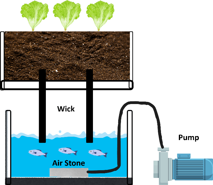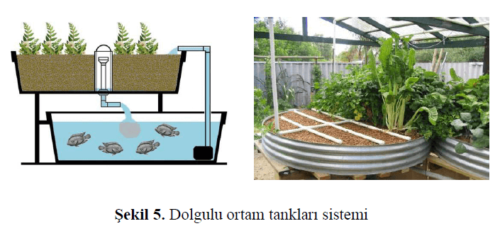 Hydroponic units are established by planting vegetation into tanks filled with filter media such as perlite or gravel, which act as biofilters (Şekeroğlu et al., 2022). The tanks containing the plants are periodically filled with water from the fish tank and then the water is returned back to the fish tank. Beneficial bacteria and sometimes worms are added to the plant tanks to facilitate the breakdown of waste (Kargın & Bilgüven, 2018). An example of this system is shown in Figure 5.